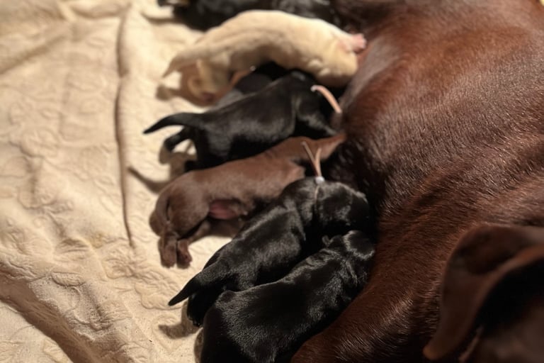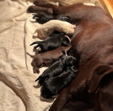 As of November 2025, Amber had a little of 7 beautiful pups, all colors this time. Contact us today to take home one of these cuties!
